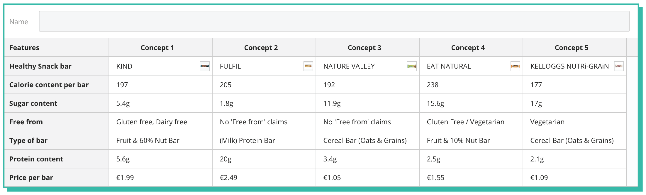 A preference (utility) score was captured for each feature of the bars tested, which enabled the brand to evaluate how its brand/product, features of its product, (e.g., calorie content, sugar content, ingredients, etc.), and price, when stacked up against the competition.
